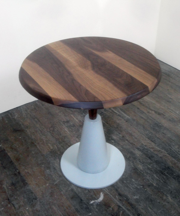 This table is our take on a classic solid walnut top with a reverse knife edge. The base features a wood post with a turned base and plate painted in a clear white to accent the table. To bring the price down, we combined the walnut top with solid maple on the bottom where the wood was painted white.